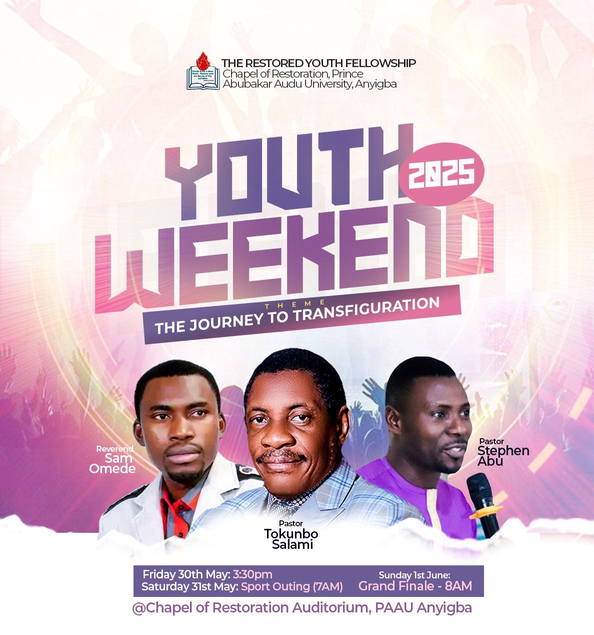 City Church 1773 Turkey Pen Road, NY, United StatesYouth Weekend 2025Organised by The Restored Youth Fellowship, Chapel of Restoration, Prince Abubakar Audu University, Anyigba. Theme: The Journey to Transfiguration This is a special 3-day event for young people filled with spiritual growth, fun activities, and celebration. Event Schedule: Guest Ministers: Venue: Chapel of Restoration Auditorium, PAAU Anyigba Come and be part of a...
