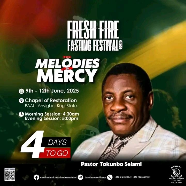 City Church 1773 Turkey Pen Road, NY, United StatesFresh Fire Fasting Festival 2025 Organised by Chapel of Restoration, Prince Abubakar Audu University, Anyigba, Kogi State. Theme: Melodies of Mercy This is a special 4-day fasting and prayer festival designed for spiritual breakthrough, divine encounters, and experiencing God's mercy. Event Schedule: Guest Minister: Venue: Chapel of Restoration, PAAU Anyigba, Kogi State Come and experience...