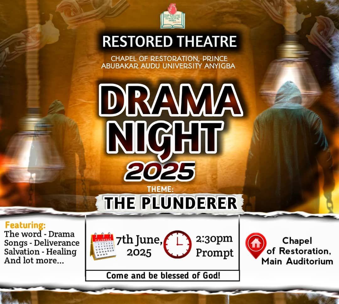 City Church 1773 Turkey Pen Road, NY, United StatesDrama Night 2025 Organised by Restored Theatre, Chapel of Restoration, Prince Abubakar Audu University, Anyigba. Theme: The Plunderer This is a special evening event featuring powerful drama, worship songs, deliverance, salvation, healing and much more. Event Schedule: Featuring: Venue: Chapel of Restoration Main Auditorium, PAAU Anyigba Come and be blessed of God!