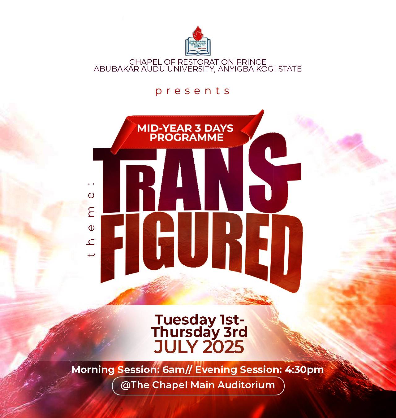 City Church 1773 Turkey Pen Road, NY, United StatesMid-Year 3 Days Programme 2025 Organised by Chapel of Restoration, Prince Abubakar Audu University, Anyigba, Kogi State. Theme: Transfigured This is a special 3-day mid-year programme designed for spiritual transformation, renewal, and experiencing God's glory in a fresh way. Event Schedule: Venue: The Chapel Main Auditorium, PAAU Anyigba Come and experience divine transfiguration as we...